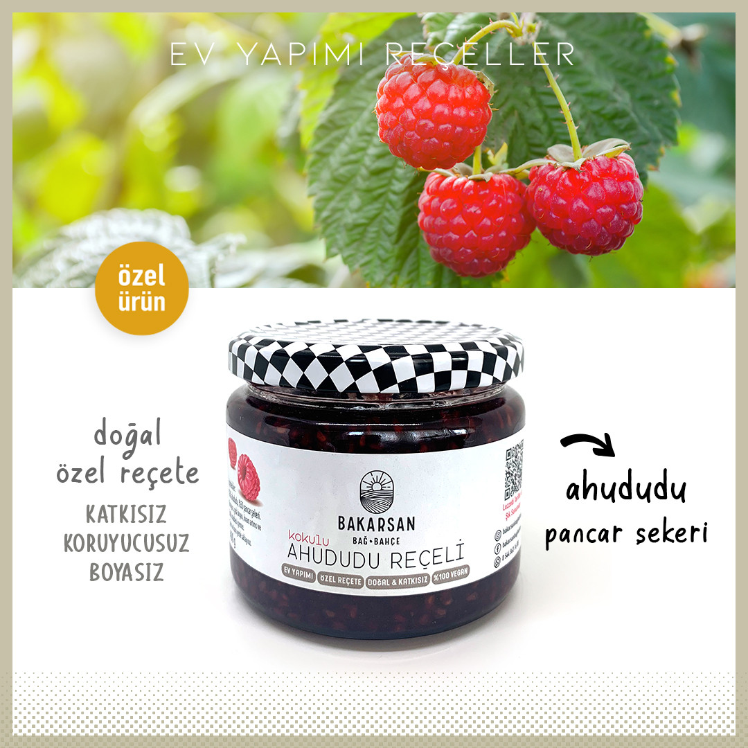 Dağ köylerimizde yetişen ahududuların doğal lezzetiyle hazırlanan Ahududu Reçelimiz, A, B ve C vitaminleri açısından zengin bir lezzet ziyafeti sunar. En çok sevilen orman meyvelerinden olan ahududu kahvaltılarınıza çok yakışır. Tamamen doğal içeriklerle hazırlanan bu reçel, tatlılarınıza ve pastalarınıza benzersiz bir tat katar.