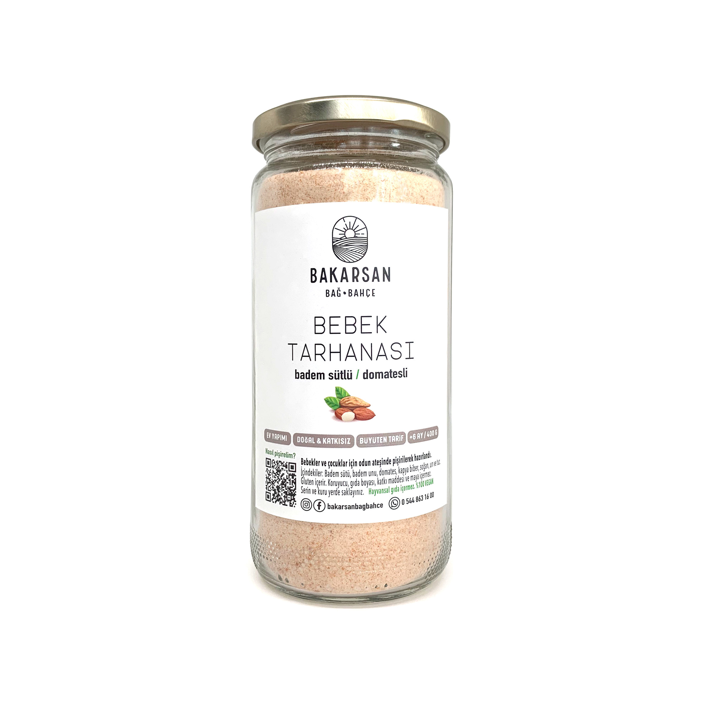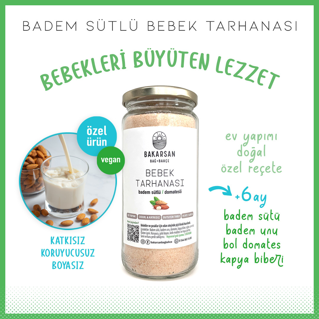 Süt ve hayvansal gıda duyarlılığı olan bebekler için özel olarak hazırlanan, Türkiye’de ilk ve tek olan Badem Sütlü Domatesli Bebek Tarhanamız, ek gıdaya geçiş sürecinde bebeğiniz için mükemmel bir yardımcıdır. 1 yaşını doldurmuş bebekler için ideal olan bu tarhana, badem sütü, badem unu, mevsiminde buharda pişirilmiş domates, kapya biber ve soğan ile zenginleştirilmiştir. Mayasız ve mide dostu bir üründür.