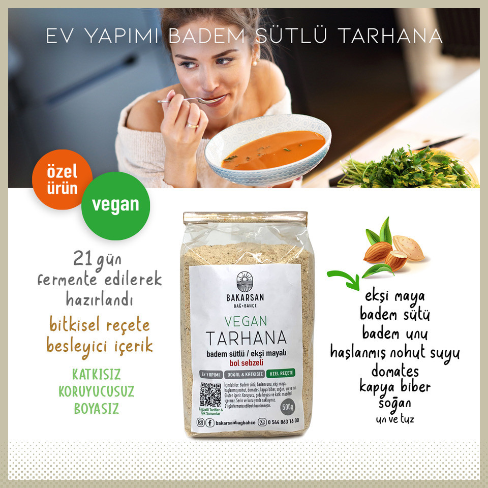 Pişirme Önerisi: Vegan tarhananızı çorba olarak pişirebilir veya sebze çorbalarında kıvam ve lezzet verici olarak kullanabilirsiniz.