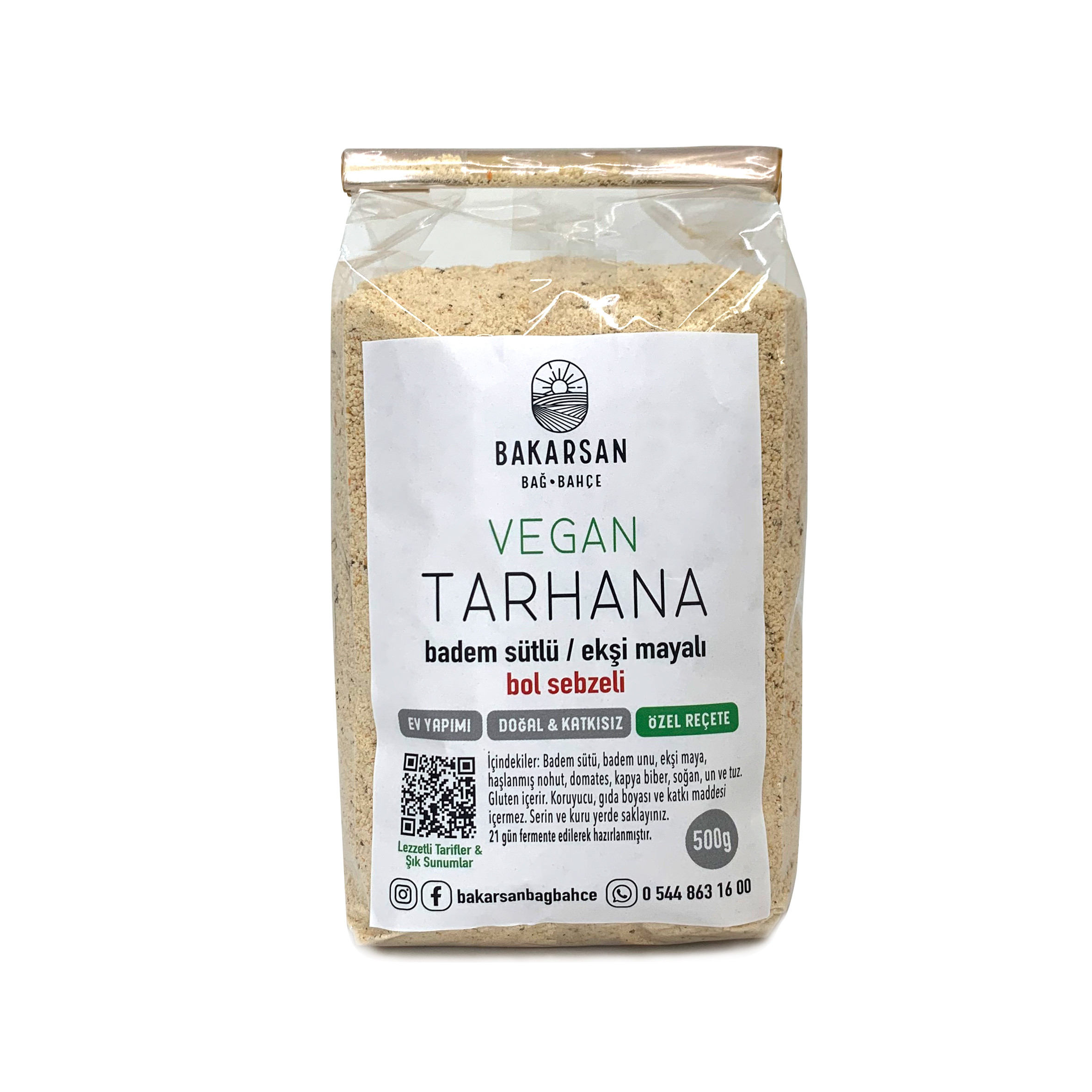 Vegan beslenmeye özel olarak geliştirilen Ekşi Mayalı Bol Sebzeli Vegan Tarhanamız, badem sütü, badem unu ve nohut ile ekşi maya harmanlanarak hazırlanıyor. Bol domates, kapya biber ve soğan ile zenginleştirilen ve bol probiyotik içeren bu tarhana, 21 gün boyunca her gün yoğurularak fermente edilmiştir.