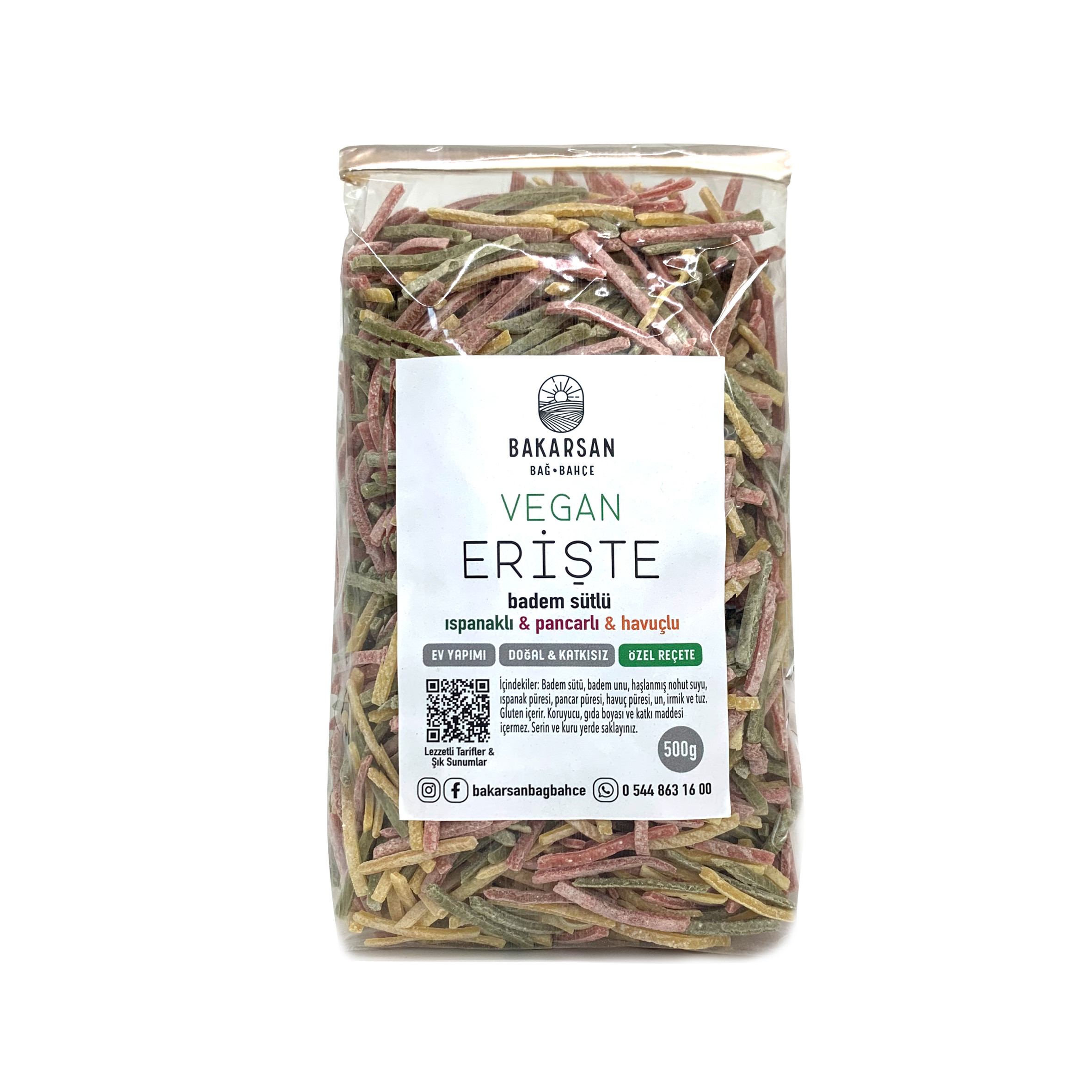 Besin değeri çok yüksek olan Badem Sütlü Karışık Vegan Eriştemiz, pancar, ıspanak, havuç, haşlanmış nohut suyu ve badem sütü ile hazırlanır. Bu çeşitli sebzelerin zenginliği, vegan dostlarımız için lezzetli ve sağlıklı bir alternatif sunar. İncecik açılıp saçta pişirilen hamurumuz, özel ölçüde kesilerek, geleneksel bir dokunuşla günlük beslenme ihtiyaçlarınızı karşılar.