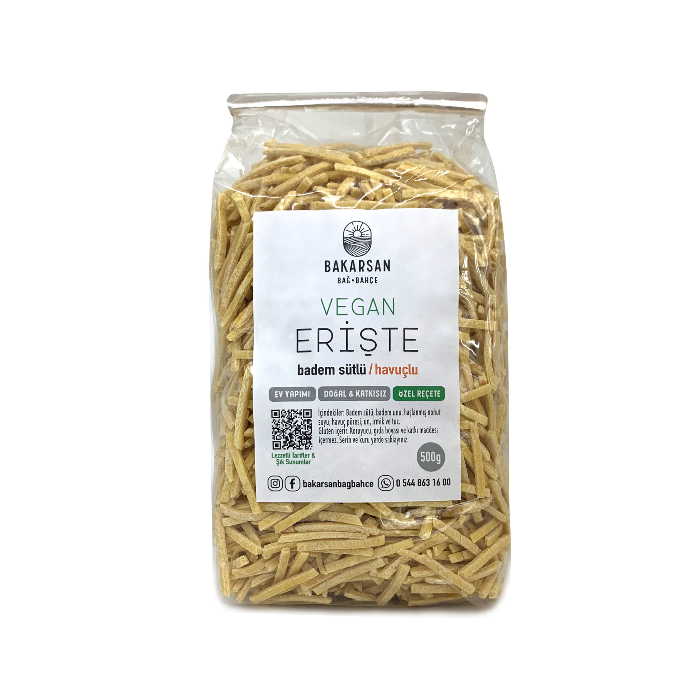 Havuç püresi, badem sütü, badem unu ve haşlanmış nohut suyu ile zenginleştirilen Badem Sütlü Havuçlu Vegan Eriştemiz, besin değeri yüksek ve lezzetli bir vegan seçeneğidir. İncecik açılıp saçta pişirilen hamurumuz, özel ölçüde kesilerek, geleneksel bir dokunuşla günlük beslenme ihtiyaçlarınızı karşılar.