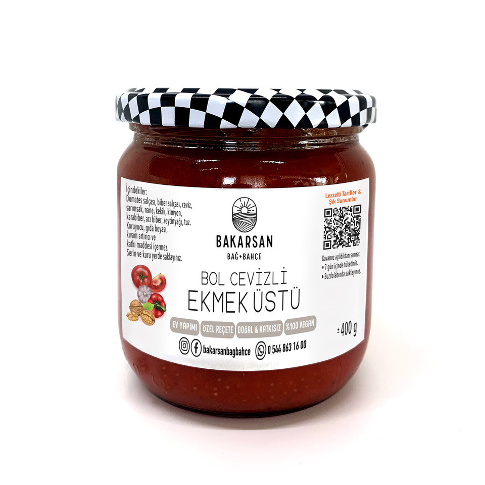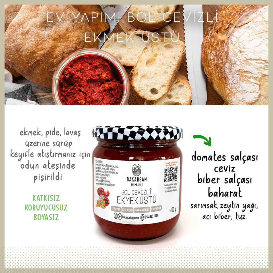 Bol Cevizli Ekmek Üstü koruyucu, gıda boyası, kıvam arttırıcı veya katkı maddesi içermez; tamamen doğal ve sağlıklıdır. Taze mevsim domateslerinden yapıldığı için ferahlatıcı bir tada sahiptir.