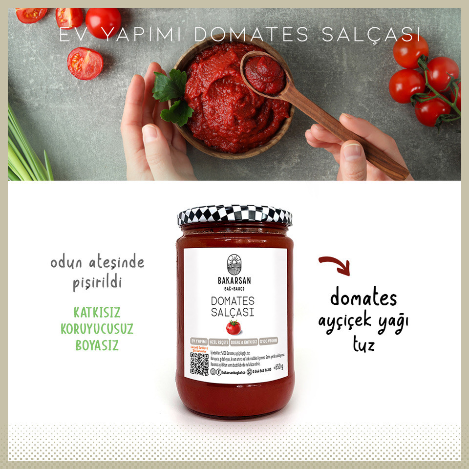 Kendi arazimizde ilaçsız olarak yetiştirdiğimiz domateslerden, odun ateşinde yavaş ve uzun süre kaynatarak yoğun kıvama ulaşan salçamızı yemeklerde, çorbalarda hatta ekmeğin üzerine sürerek kullanabilirsiniz. Ev yapımı bu salça, tüm yemeklerinize zengin bir tat ve renk katacak.