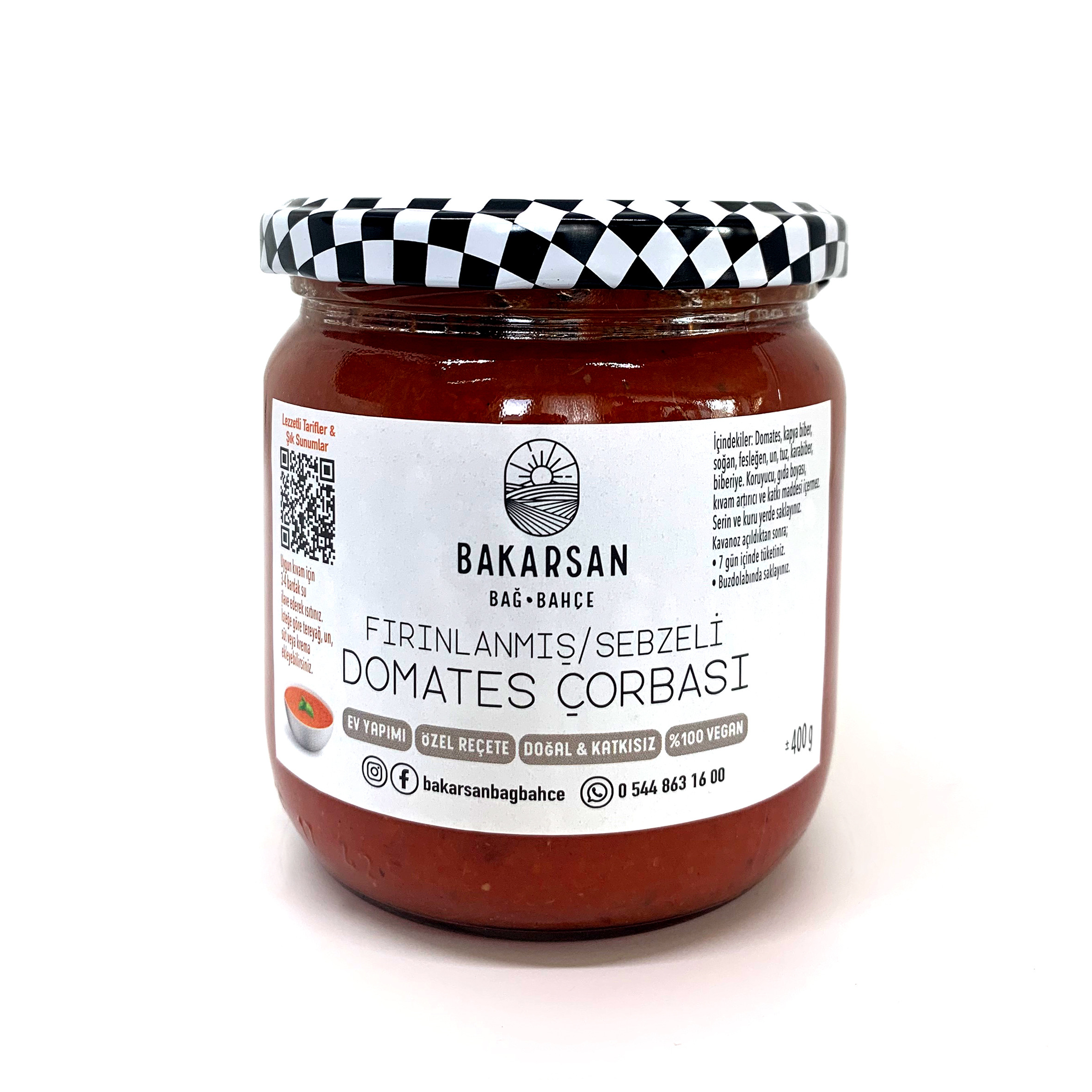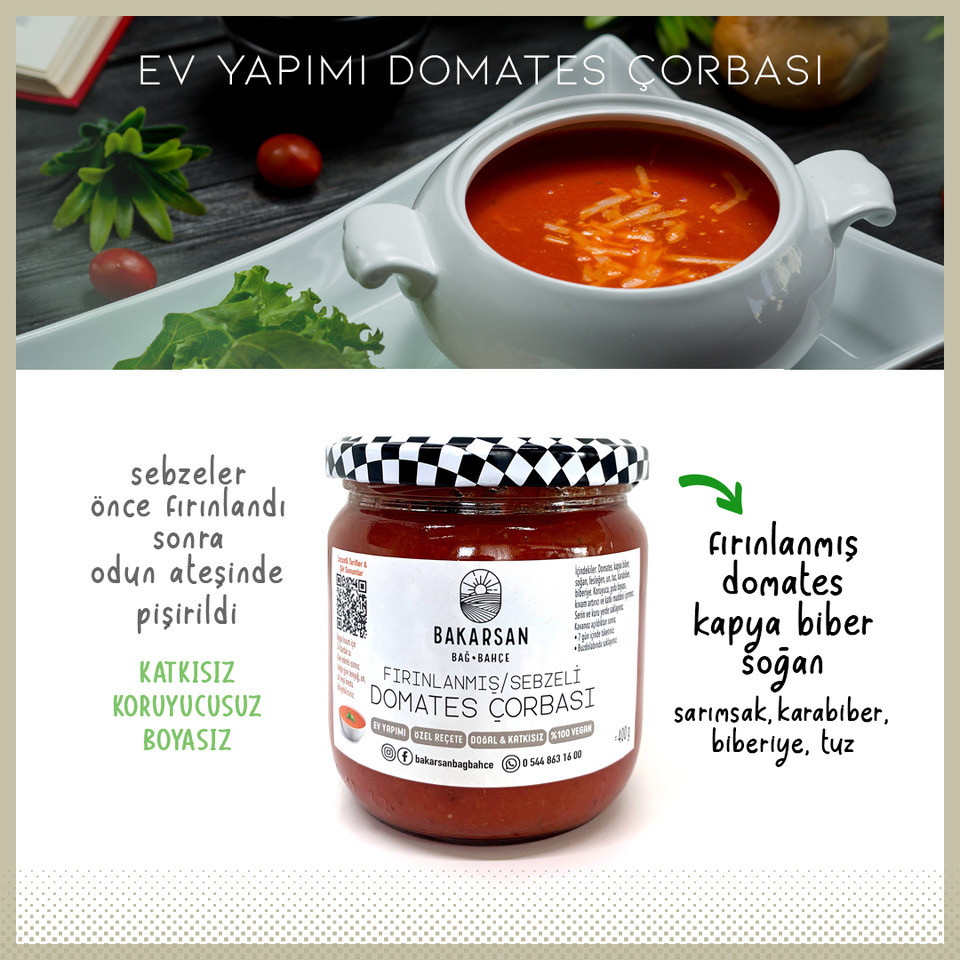 Yaz mevsiminde, kendi arazimizde ilaçsız yetişen taze domateslerimizi kapya biber, soğan, sarımsak, fesleğen, biberiye, karabiber ve tuz ile birlikte fırınlıyoruz. Çok lezzetli, yoğun kıvamlı, bol sebzeli çorbamız, yemek hazırlıklarınızı kolaylaştırıp, harika bir deneyim sunuyor.