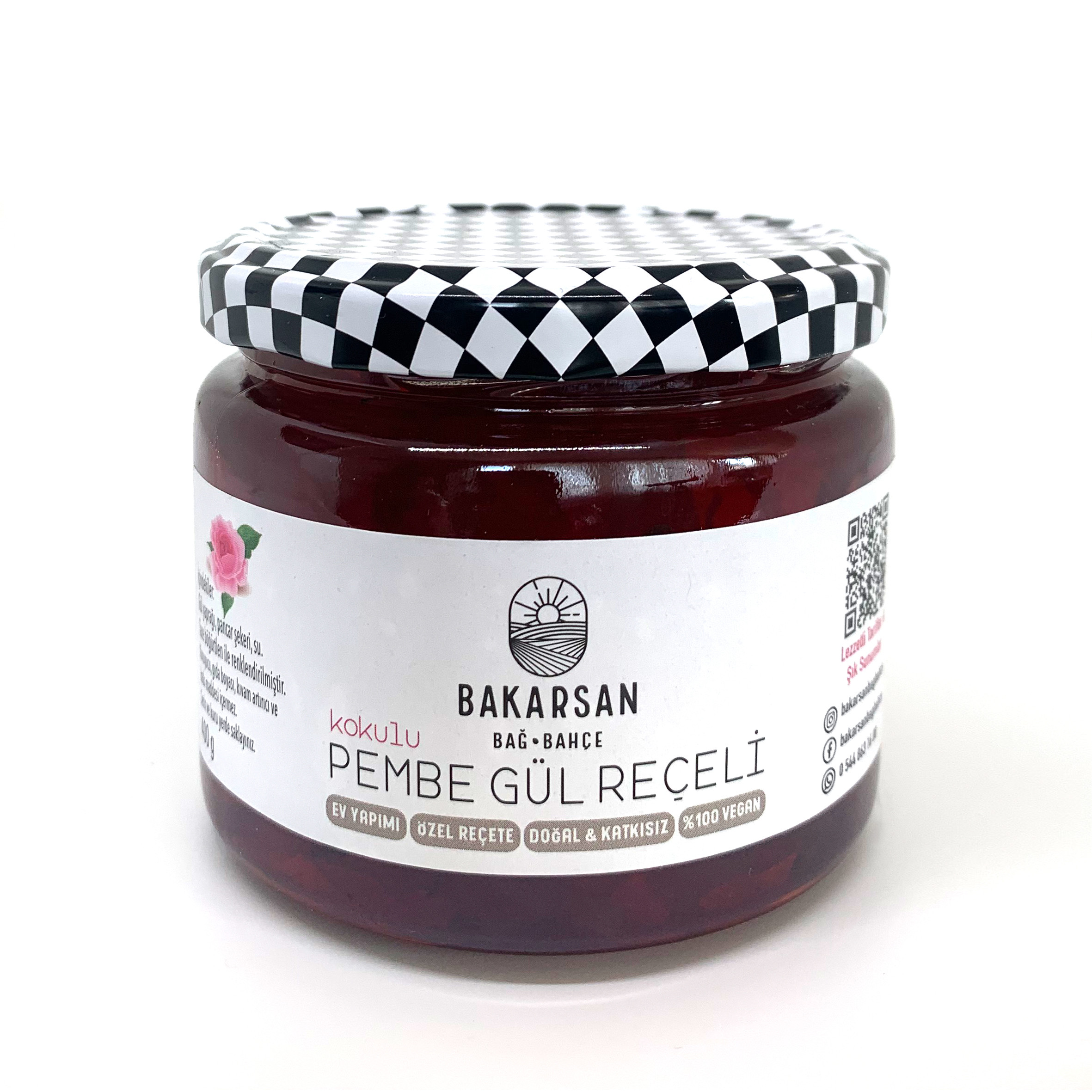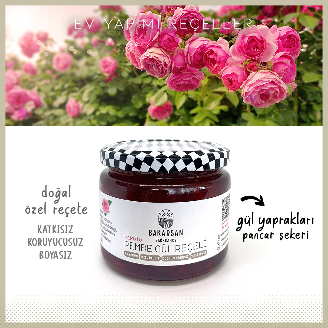 Bahçemizin mis kokulu güllerinden hazırladığımız bu gül reçeli, doğallığın ve geleneksel lezzetlerin tadına varmanız için harika bir seçim. Taze böğürtlen ile renklendirdiğimiz gül yapraklarının kokusunu korumak adına, reçelimizi kaynatırken içme suyu kullanıyoruz ve kıvamını doğal pişirme ile sağlıyoruz. Reçelimiz rengini taze böğürtlenden alıyor. Herhangi bir koruyucu, yapay gıda boyası veya kıvam arttırıcı katkı maddesi içermez.