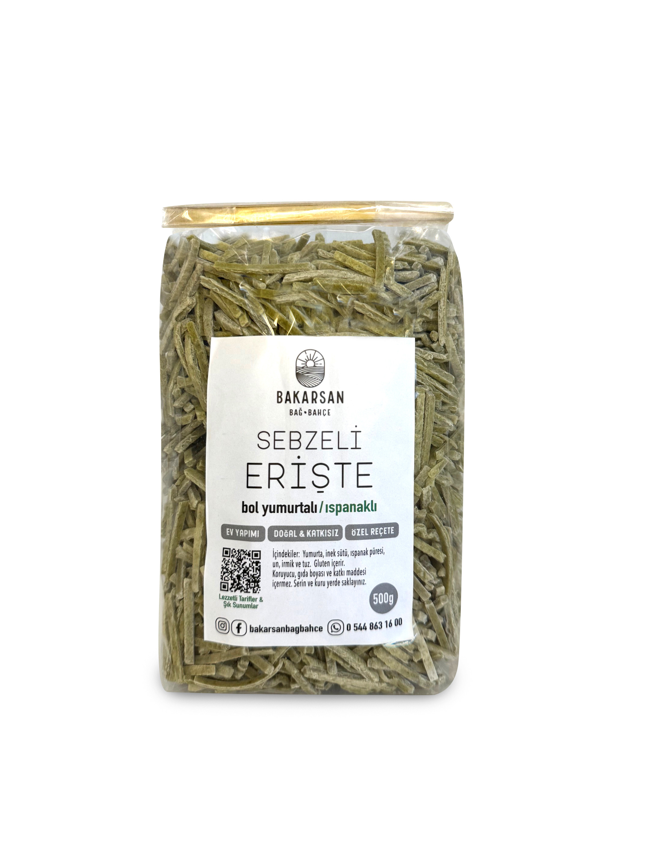 Ispanaklı Eriştelerimiz, bolca yumurta ve buharda pişirilmiş ıspanak içeriyor. Katkı maddesi, renklendirici veya koruyucu kimyasal içermeyen bu geleneksel ‘Türk Makarnası’, siz ve sevdikleriniz için lezzetli ve tek başına doyurucu bir öğün sunuyor.