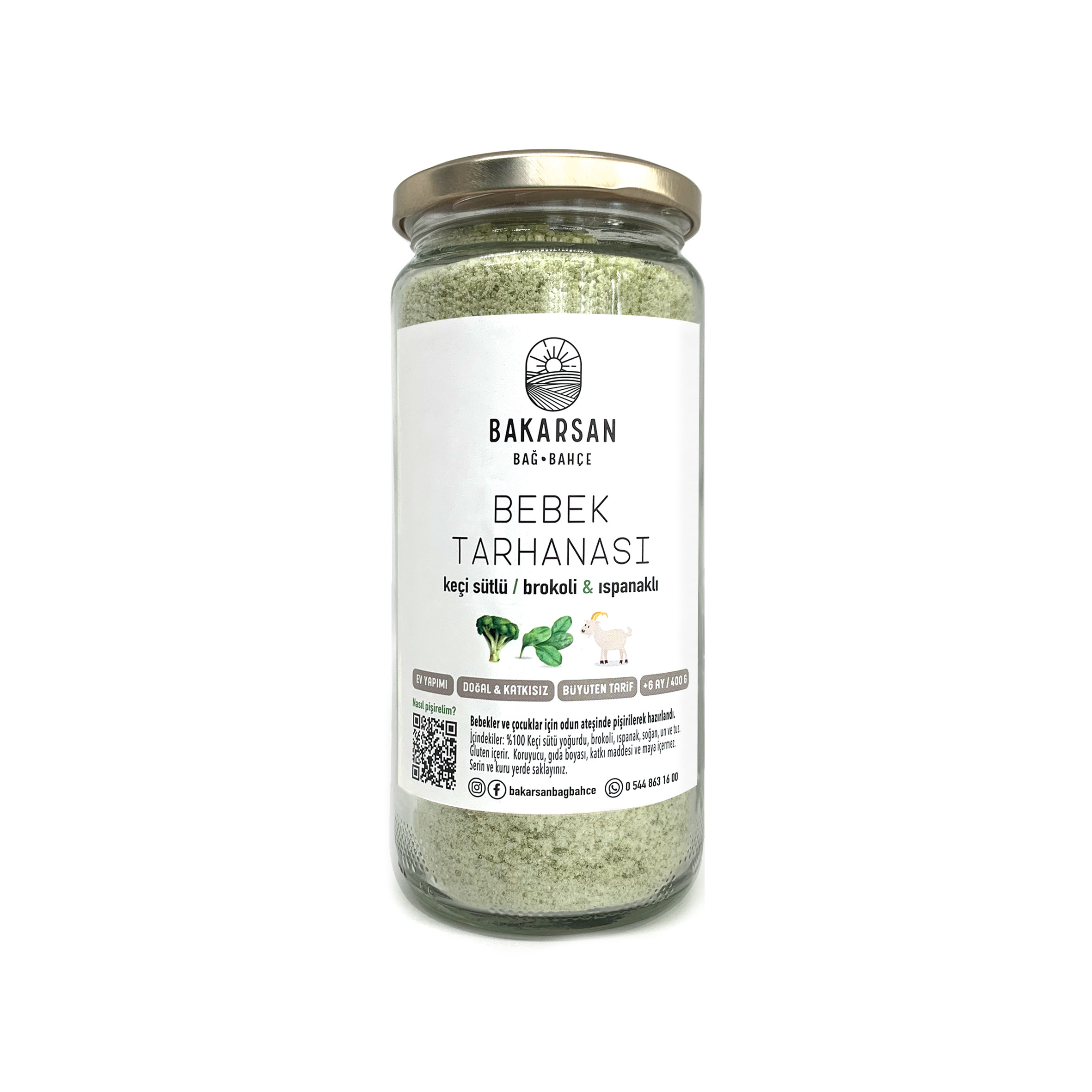Altıncı ayını doldurmuş bebekler için özel olarak hazırlanan, Türkiye’de ilk ve tek olan Keçi Sütlü, Brokoli ve Ispanaklı Bebek Tarhanamız, besleyici ve mide dostudur. Evde mayaladığımız keçi sütü yoğurdu, mevsiminde buharda pişirilmiş brokoli ve ıspanak ile zenginleştirilmiştir. Bebekler ve çocuklar için mayasız olarak hazırlanır ve odun ateşinde pişirilir.