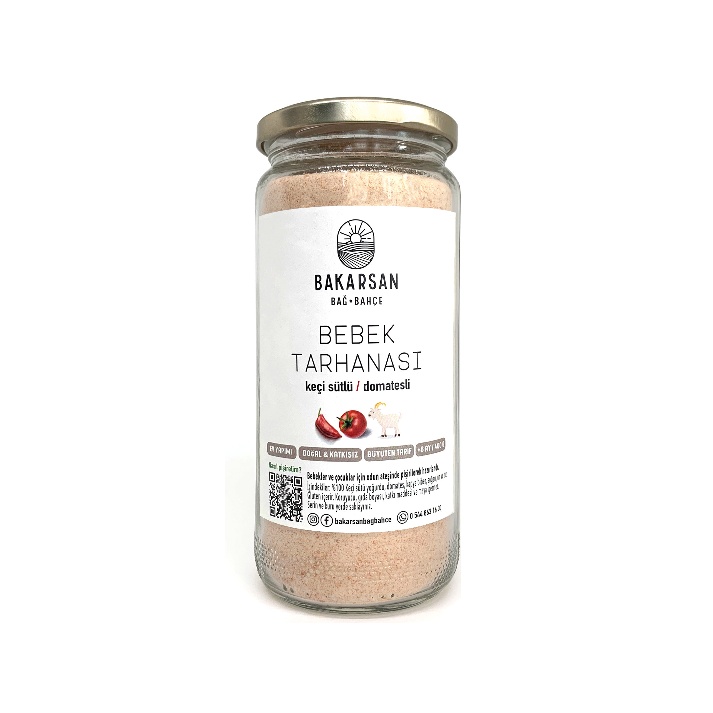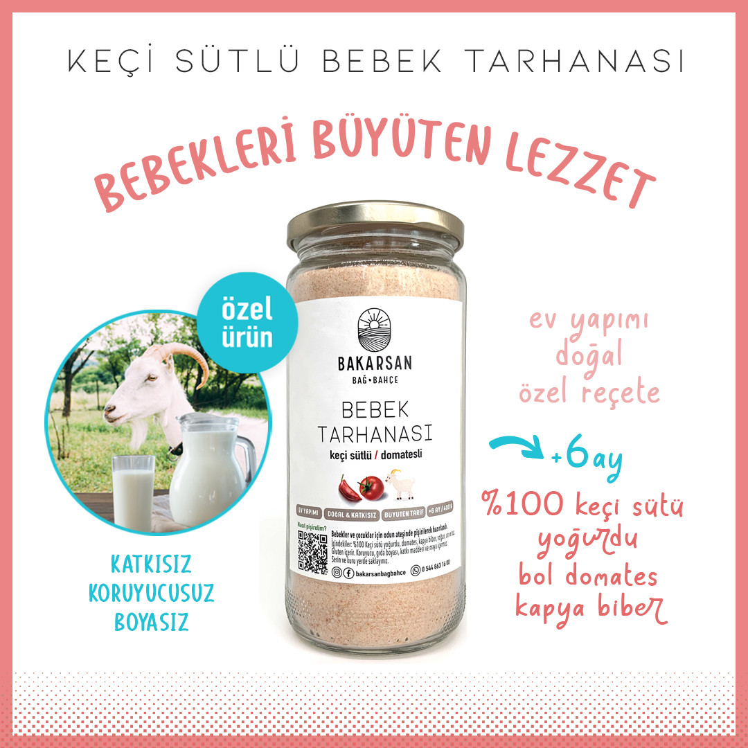 Ek gıdaya geçiş sürecinde bebekler için ideal olan Keçi Sütlü Domatesli Bebek Tarhanamız, besin değeri yüksek, sağlıklı, güvenilir ve mide dostu bir üründür. %100 keçi sütü yoğurdu, mevsiminde buharda pişirilmiş domates, kapya biber ve soğan ile odun ateşinde pişirilerek mayasız olarak hazırlanır.